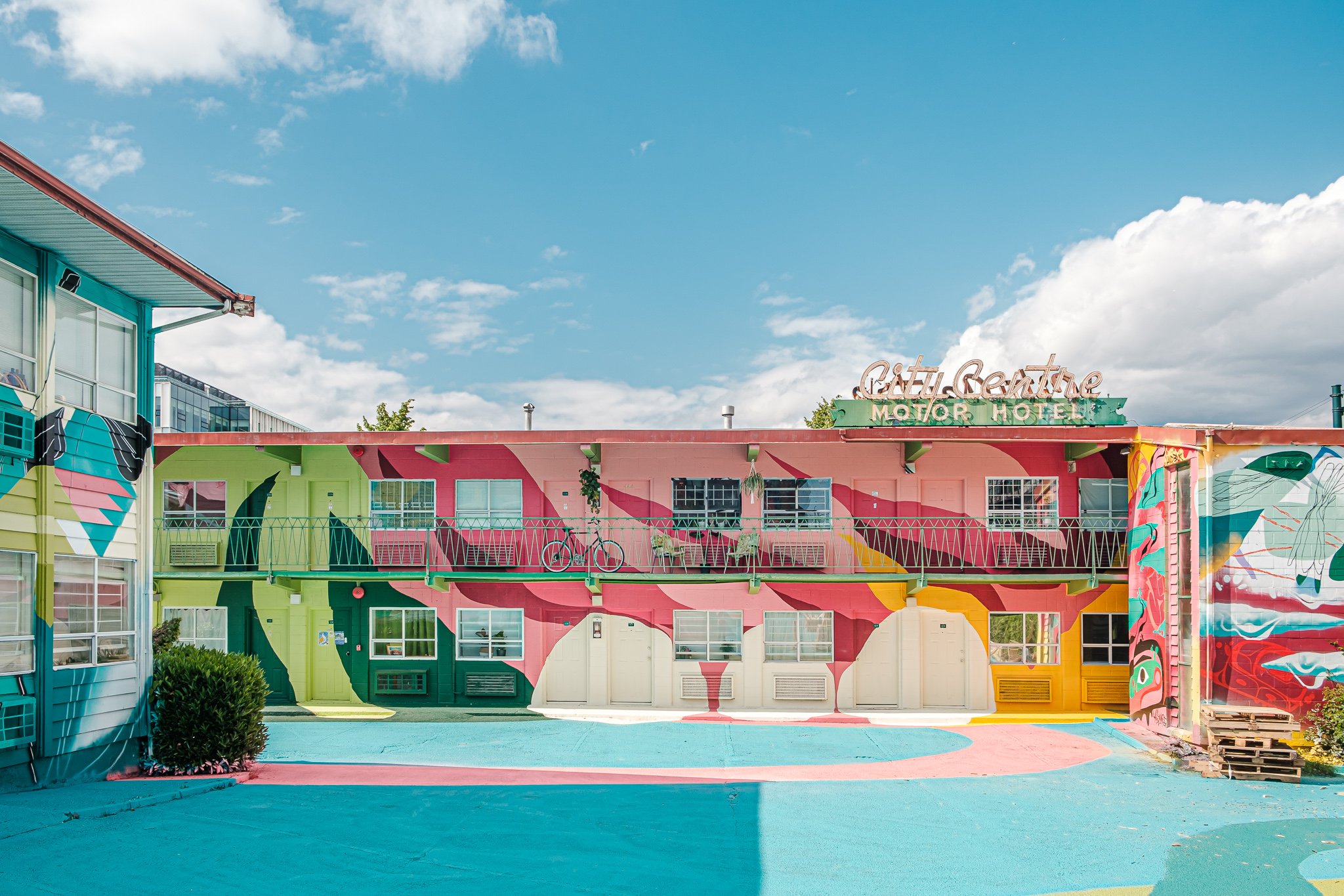 VMF is bringing the creative potential of City Centre to life by completely transforming the exterior (full building facade and parking lot) with its largest mural to-date. Designed by local artists, Fiona Ackerman, KC Hall and Joon Lee, the full-wrap mural combines the 3 artists’ styles while taking inspiration from the iconic motel’s original elements.
