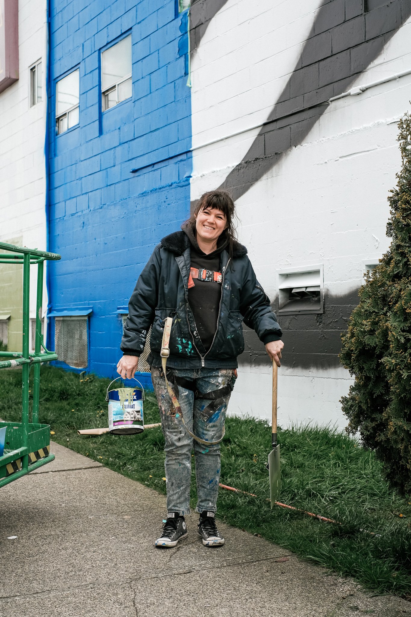 Bringing together vastly divergent styles and backgrounds, the artists have transformed the iconic City Centre Motel into a singular mural stretching across all of its surfaces. The artists’ approach has intentionally taken the spontaneity of hands-on art making to a massive scale to celebrate, amplify, and deconstruct the architecture of this Vancouver landmark — simultaneously looking at its aesthetics of a classic midcentury motor hotel, and its current use as temporary artist studios. Moving around the two buildings and the ground, each artist’s direction is brought into focus at different moments while tactically never relinquishing collaborative ownership from the whole. The mural becomes a mirror of what the City Centre Artist Lodge aspires to be: artists discovering each others’ working processes, being pushed in unexpected directions, and working alongside each other to shape this city.