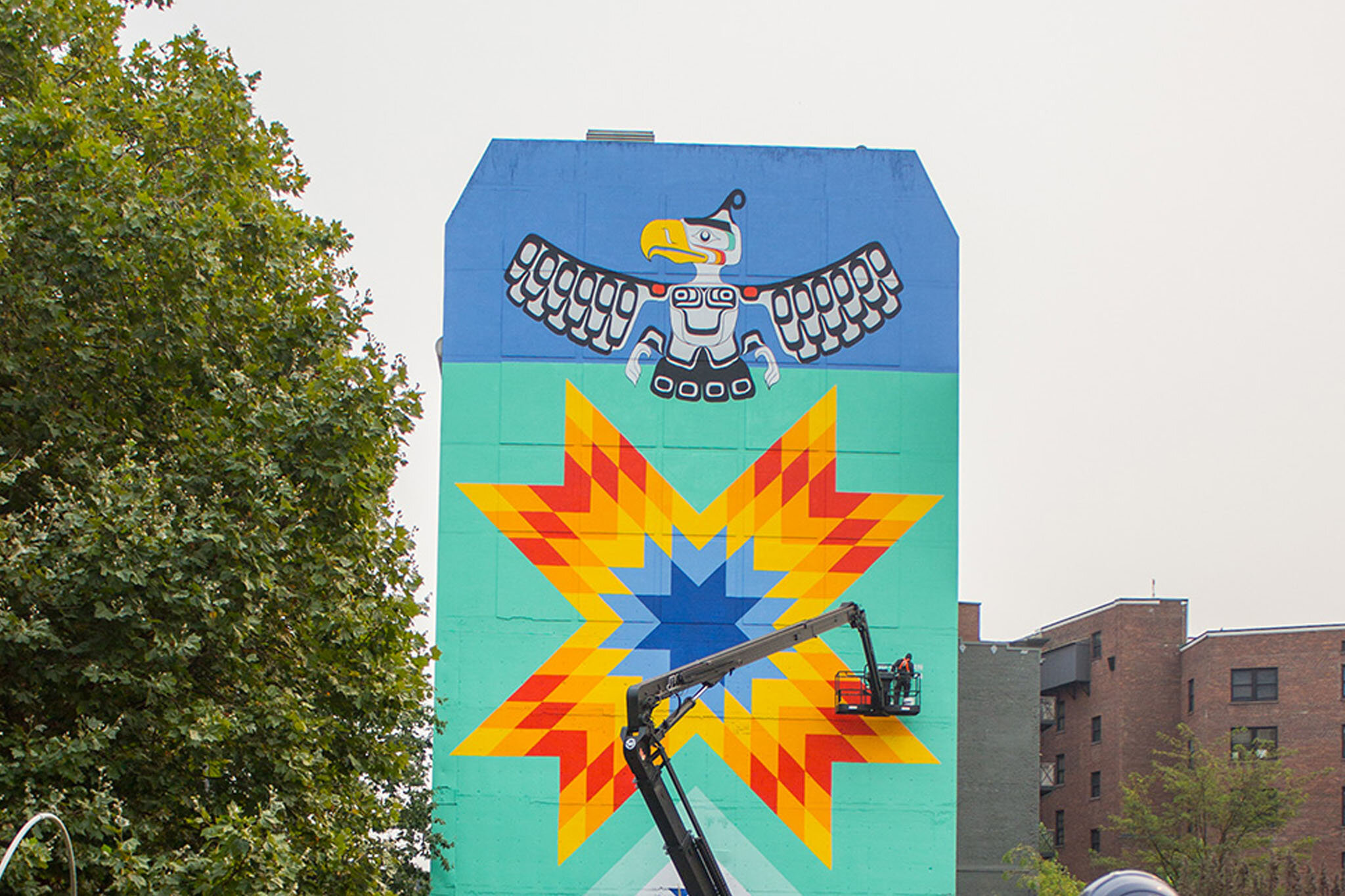Featuring Indigenous designs from across turtle island as well as local Musqueam, Squamish and Tsleil-Waututh (MST) design, the Star Blanket Mural was a co-creation between many artists and organizations working in communities affected by the fentanyl overdose crisis. The mural was intended as a site of meaning and beauty for the people who live in the Downtown East Side (DTES). It is both a memorial to those who have died during the ongoing crisis and a bright gift for the folks who live there.