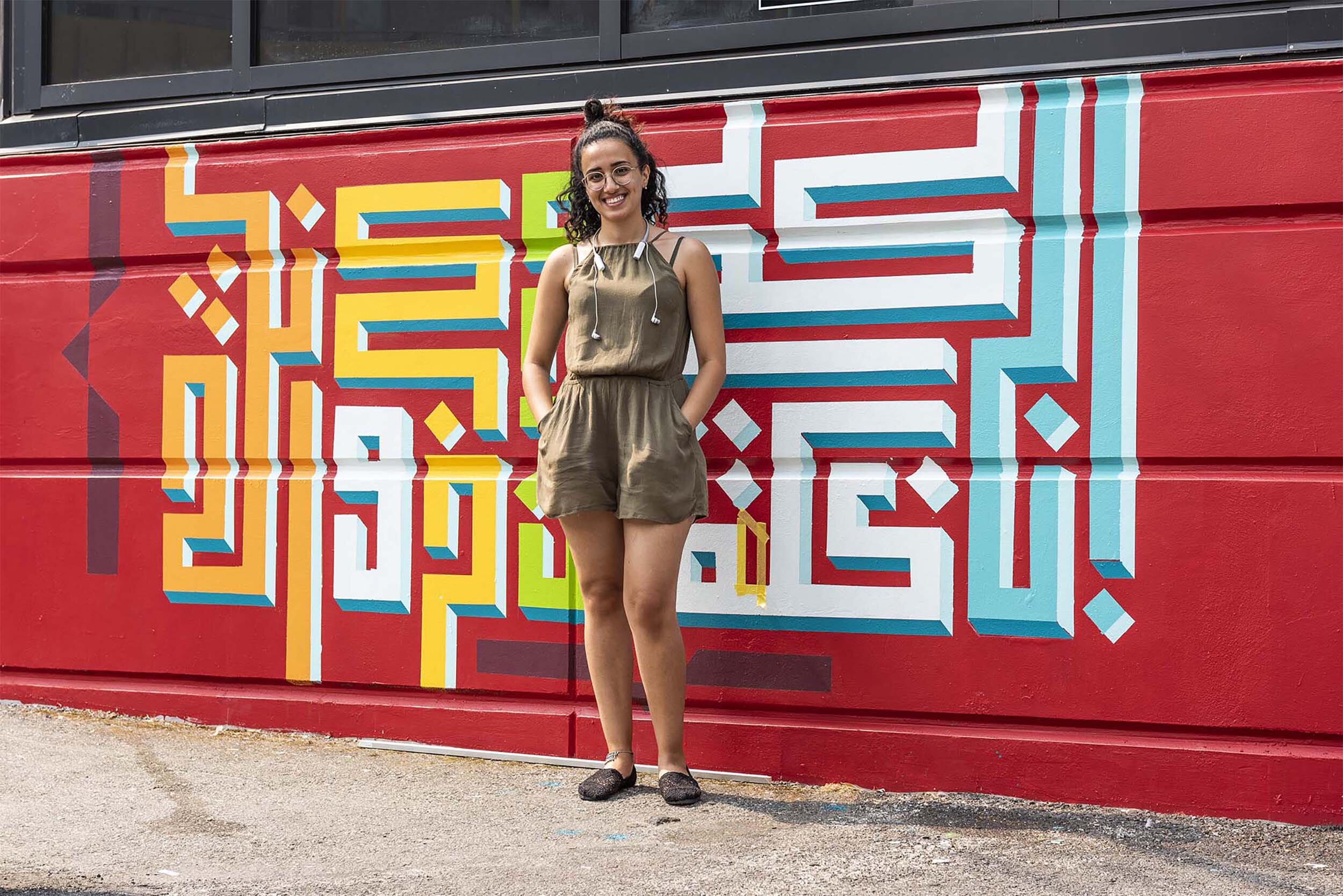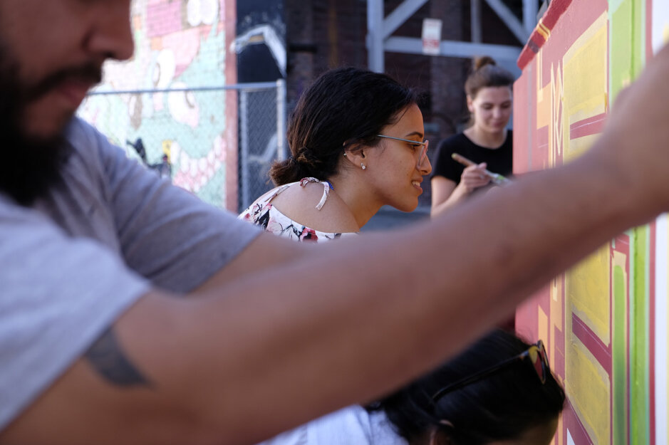 Doaa’s mural, “Why can’t they see us?,” utilizes a modern version of the traditional Arabic Kufic script to convey a message of pluralism and learning from differences using a verse taken from the Quran – “We have created you from male and female, and made you into nations and tribes that you may know one another.” (49:13) In the weeks leading up to the festival, the mural became a hub of community connection as friends and volunteers came to help paint the mural and bring water and food to feed Doaa and the other artists. The excitement peaked at the festival’s launch and we hope the area continues to be a point of pride and a place of connection for years to come.
